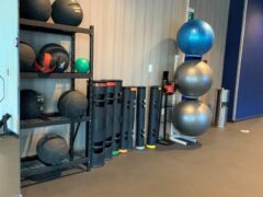 Dumbbells to up to 100 lbs/45 kgs and there’re three adjustable benches to work with.