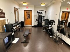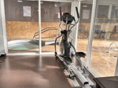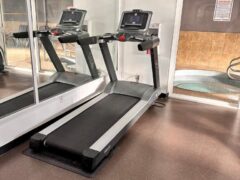 As for cardio equipment, there’s a stationary bike, a cross-trainer, and a treadmill.