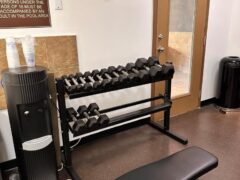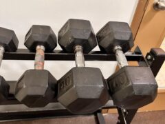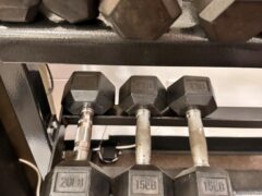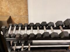 They have dumbbells (from 5 to 20 lbs/2 to 9 kgs and then a set of 40 lbs/18 kgs) and there’s also an adjustable bench.
