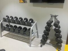Dumbbells range from 3 to 60lbs/1.5kg to 27.5kg and there’s an adjustable bench as well.