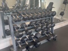 Dumbbells range from 5 to 60 lbs/2 to 27 kgs and there’re two adjustable benches including the decline option.