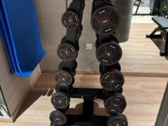 Dumbbells go up to 44 lbs/20 kgs and there’s an adjustable bench as well.
