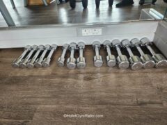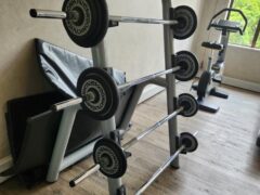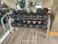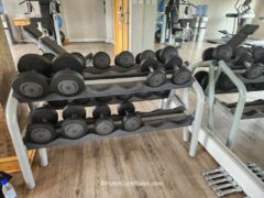 Dumbbells go up to 62 lbs/28 kgs (but some are missing) and barbells go up to 55 lbs/25 kgs. There’re two adjustable benches as well.