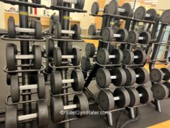 There’s a nice selection of dumbbells (up to 110 lbs/50 kgs), kettlebells, and barbells.