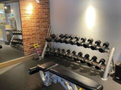 Dumbbells range from 5 to 50 lbs/2 to 22 kgs and there’s a couple of adjustable benches as well.