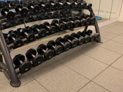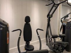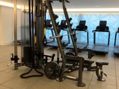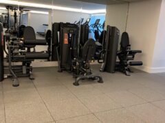 There’s a fully equipped squat rack, ab/adduction machines, a cable machine, a chest press machine as well as a machine for lat pull-downs. There’s a solid selection of dumbbells and two adjustable benches.