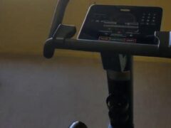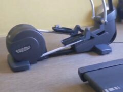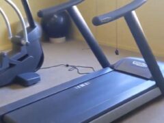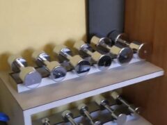 Besides dumbbells up to 22 lbs/10 kgs and a pair of exercise balls, there’s a cross-trainer, a treadmill and a stationary bike – that’s it.