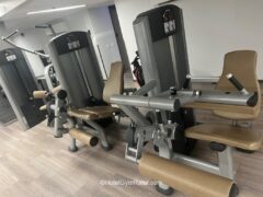 There’s a range of pin-operated machines – for example, leg curls, leg extensions, shoulder press, seated crunches and lat pull-downs.