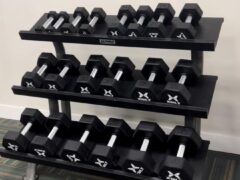 Dumbbells go up to 50 lbs/22 kgs and there’s an adjustable bench as well.