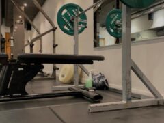 There’s a bench and a squat rack with plenty of weight plates as well as different bars.