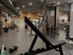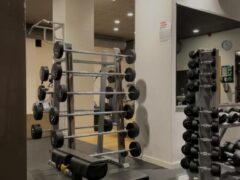 There’s a solid selection of kettlebells, barbells (up to 55 lbs/25 kgs) and dumbbells (up to 110 lbs/50 kgs) and several adjustable benches.