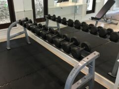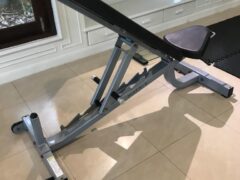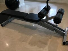 There’re dumbbells going up to 27 lbs/12 kgs, an adjustable bench and an adjustable decline/sit up bench. There’s also an exercise ball.
