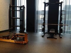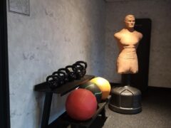 A fairly decent range of dumbbells although somewhat limited to lower weights. There’s a squat rack with a fair selection of weight plates. There’s also a few kettle bells and a cable machine.