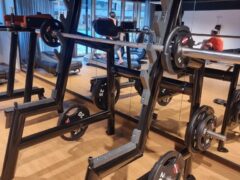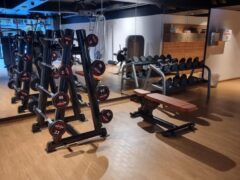The hotel gym offers two barbells (44 lbs/20 kgs) with enough weight plates. In addition, there’re several curl bars (up to 53 lbs/24 kgs). There’s one rack for e.g. squats, deadlifts, rows and one for bench presses. Dumbbells go up to 31 lbs/14 kgs. You’ll also find a pulley tower, a lat machine, chest-press and leg extension machine, a bench for abs exercise and a station for dips and leg raises.