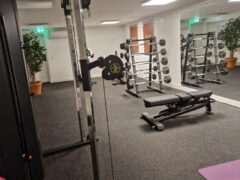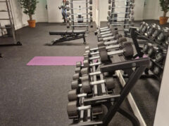 There’s a nice selection of barbells as well as dumbbells (up to 55 lbs/25 kgs) and there’s also an adjustable bench to work with.