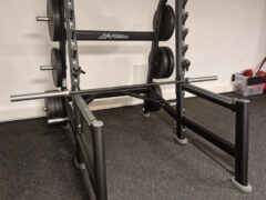 There’s a squat rack/barbell bench press setup with a fair range of weight plates and a dual cable machine.