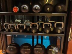 Dumbbells and kettlebells go up to 44 lbs/20 kgs and there’s an adjustable bench as well.