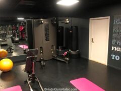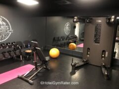 There’s a kinesis cable machine, a few exercise balls and dumbbells ranging up to 48 lbs/22 kgs.