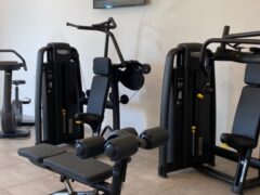 There’s a chest press machine, a leg extension machine and a lat pull-down machine.