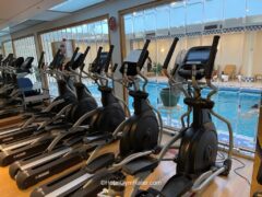 The cardio section of the hotel gym is overlooking an indoor pool.