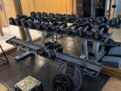 Dumbbells range from 2 to 33 lbs/1 to 15 kgs and there’s an adjustable bench as well.