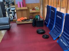 Accessories include exercise mats, a few medicine balls, some foam rollers, a few elastics and a random selection of weight plates.