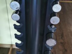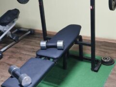 Dumbbells go up to 22 lbs/10 kgs and there’s an adjustable bench as well.