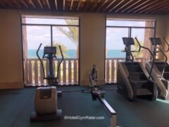 A row of the latest TechnoGym treadmills, cross trainers and stair masters overlook the ocean. There’re stationary bikes and rowing machines too.