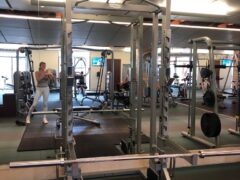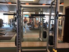 The Smith machine is smooth, there’s a squat rack with two Olympic barbells and plates, and an assisted pull-up machine.