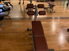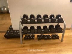 Dumbbells go up to 35 lbs/16 kgs and there’s two adjustable benches to work with – including the decline option.