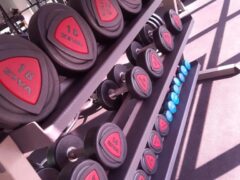 Dumbbells go up to 44 lbs/20 kgs and there’s a decline bench as well as an adjustable bench.