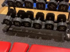 Dumbbells go up to 44 lbs/20 kgs and there’s an adjustable bench as well.