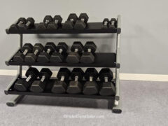 Dumbbells go up to 50 lbs/22 kgs and there’s an adjustable bench as well.