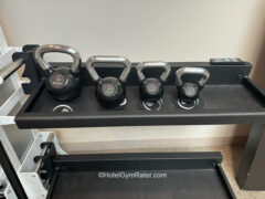 There’re dumbbells (up to 75 lbs/34kgs) as well as kettlebells (up to 30 lbs/13 kgs, but only one of each) and two adjustable benches.