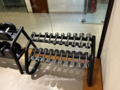 Dumbbells go up to 50 lbs/22 kgs and there’s a pair of adjustable benches to work with.