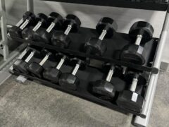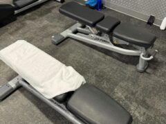 There’re kettlebells and dumbbells (up to 50 lbs/22 kgs) and a pair of adjustable benches.