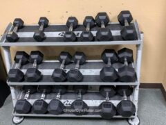 For strength workouts, there are dumbbells – from 10 to 50 lbs/4 to 22 kgs – two exercise mats.