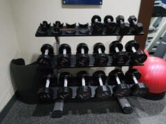 Dumbbells go up to 50 lbs/22 kgs and there’s an adjustable bench as well.