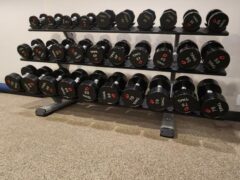 Dumbbells go up to 75 lbs/34 kgs and there’re two adjustable benches as well.