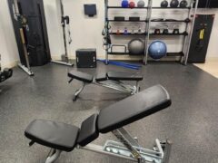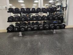 Dumbbells go up to 75 lbs/34 kgs and there’re two adjustable benches.