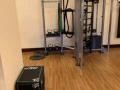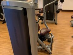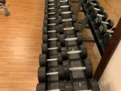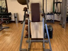 Strength equipment includes dumbbells (from 5 to 80 lbs/2 to 36 kgs), kettlebells (15lbs-40 lbs/70 to 18 kgs), a chest press machine, a pull-down machine, a seated leg press machine, a captain’s chair, and a dual cable machine as well as three adjustable benches including the decline option.