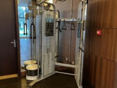 There’s also a barbell bench press setup with a fair range of weight plates and a dual cable machine.