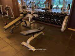 Dumbbells go up to 50 lbs/22 kgs and there’re two adjustable benches including a decline version.