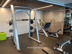 They also have a Smith machine and a decline leg press with plenty of weight plates for both. There’s also a bench for (barbell) biceps curls.