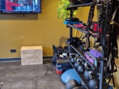 Dumbbells go up to 70 lbs/32 kgs and there’s a pair of adjustable benches too. Kettlebells go up to 53 lbs/24 kgs.