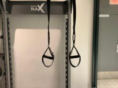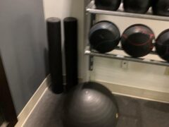 Accessories include four exercise mats, medicine balls (from 6 to 12 lbs/3 to 5 kgs), two Bosu balls, one stability ball and two foam rollers. There’s also a TRX station.
