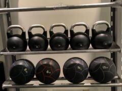 Dumbbells go up to 75 lbs/34 kgs and there’s an adjustable bench as well. Kettlebells range from 10 to 30 lbs/4 to 13 kgs.