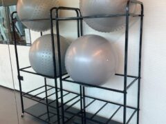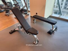 Dumbbells go up to 44 lbs/20 kgs and there’re two benches – a flat one and an adjustable one.