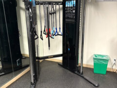 Accessories include medicine balls (from 4 to 10 lbs/2 to 4 kgs), a TRX setup, three exercise balls, three foam rollers and six exercise mats.