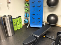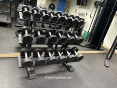 Dumbbells go up to 50 lbs/22 kgs and there’s an adjustable bench as well.